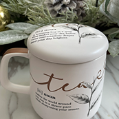 This is a cute little mug with a handy removable filter for steeping full-leaf teas, and a cover to keep it warm. Beautifully illustrated with quotes. Highly recommend for tea lovers!